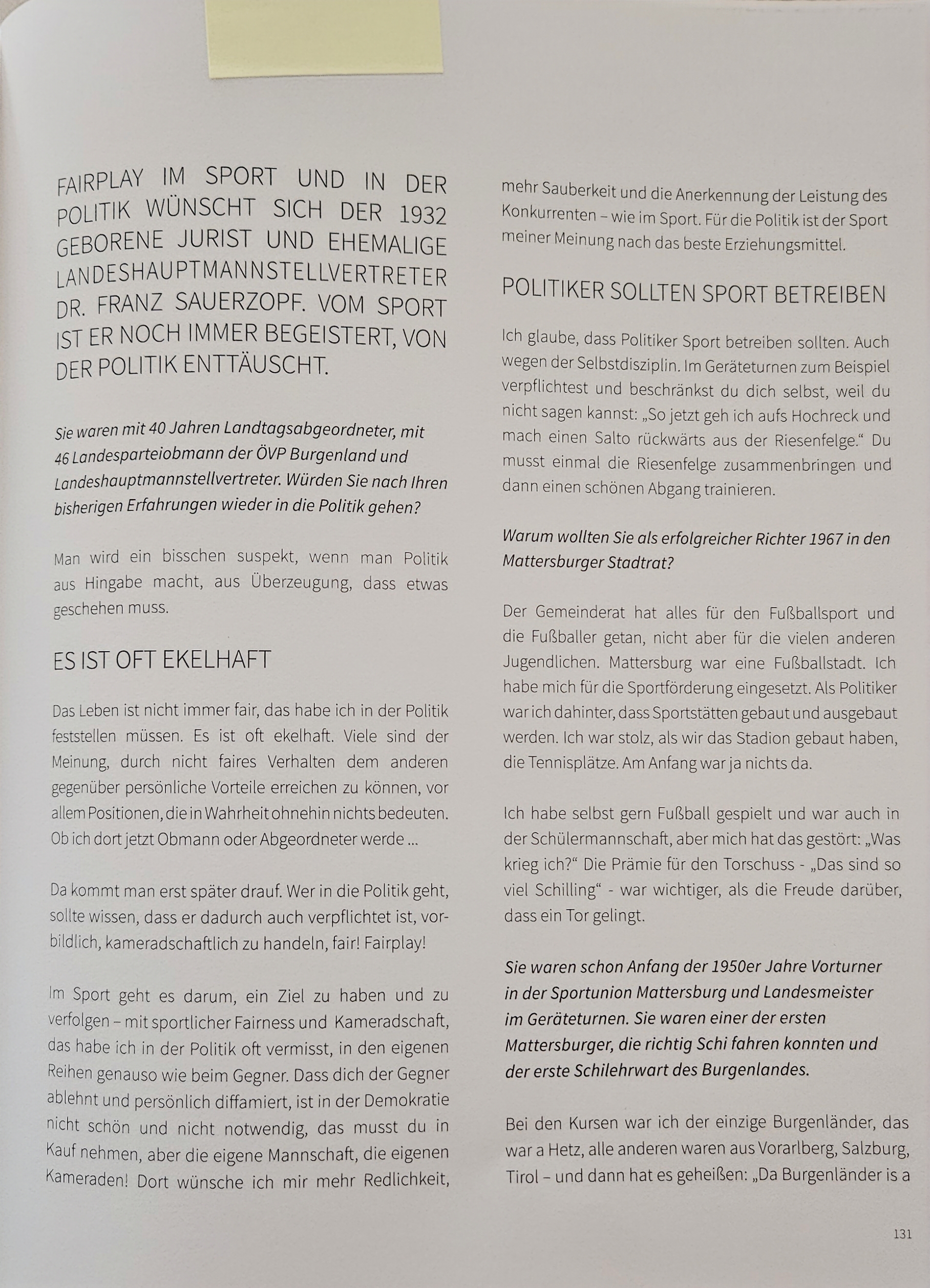 Für ihn wäre ein Leben ohne Sport fad und trist gewesen äußerte er in dem Jubiläumsbuch zum 70-jährigen Bestehen der SPORTUNION Mattersburg sowie den Wunsch das seine Freunde aus der SPORTUNION die Anerkennung bekommen, die sie verdienen, in ihrem Bemühen um Sportlichkeit und um Sportkameradschaft. Dies und noch so vieles mehr machte den Menschen Franz Sauerzopf aus.