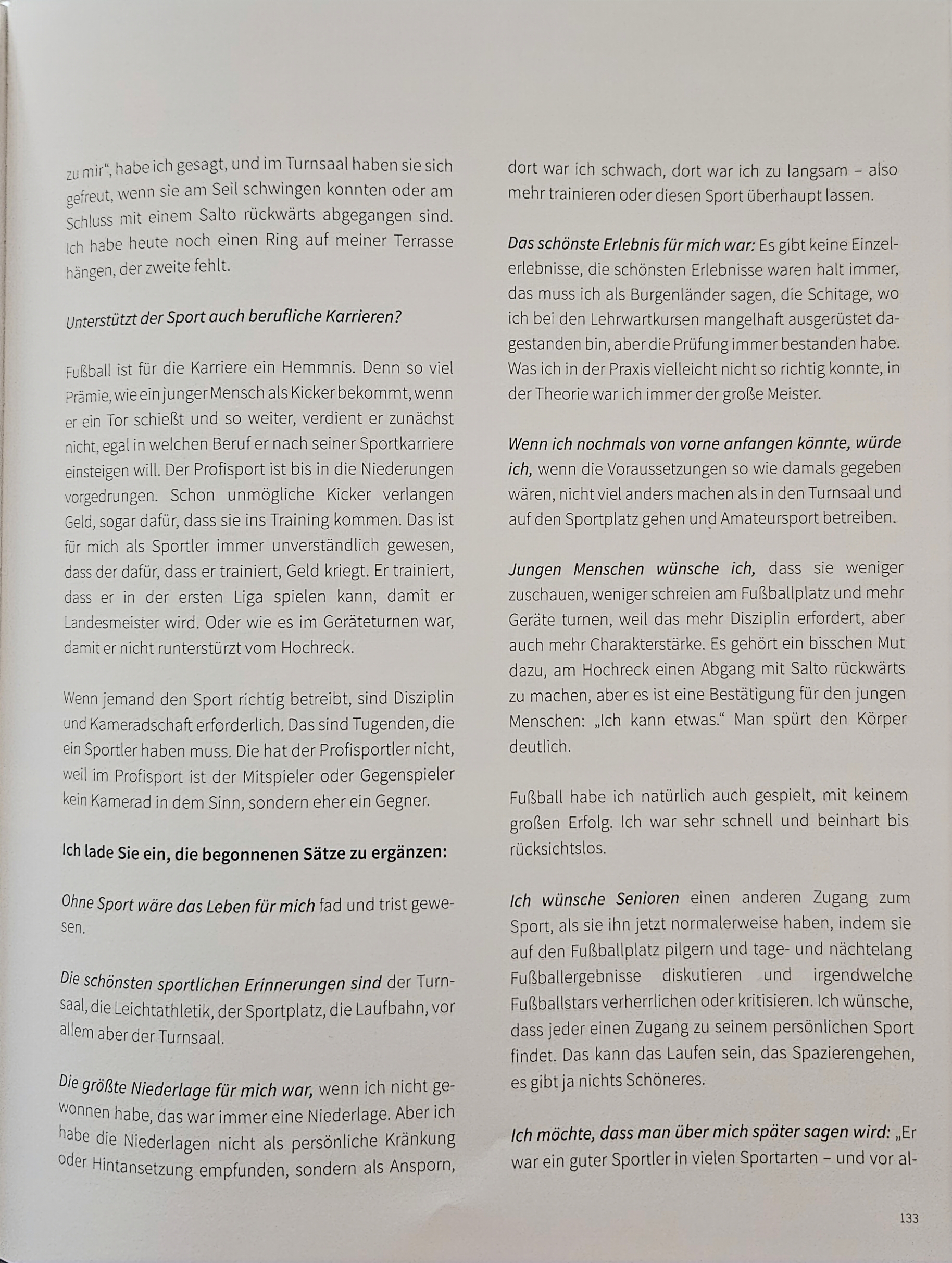 Im Buch “Sport prägt Menschen – 70 Jahre SPORTUNION Mattersburg” von Martha Wedral-Pulzer und Lieselotte Resch (Hrsg.) findet sich ein eindrucksvolles Interview mit dem Verstorbenen, der darin Einblick in seine Philosophie und sein Leben gab.
