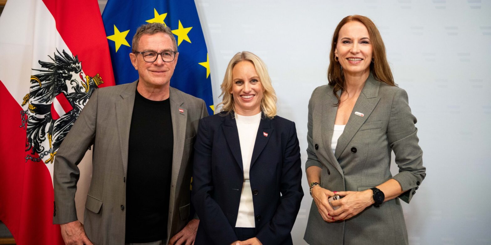 Die österreichweite Sport-Initiative „Tägliche Bewegungseinheit“ geht in die nächste Runde: Rund 400.000 Kinder in Volksschulen und Kindergärten nehmen teil – und das Programm wird weiter ausgebaut. Die Initiative startet mit prominenter Verstärkung: ÖFB-Teamchef Ralf Rangnick ist ihr neuer Botschafter. Bei einer Pressekonferenz des Bundesministeriums für Wohnen, Kunst, Kultur, Medien und Sport waren dabei: Michaela Schmidt (Sport-Staatssekretärin; Mitte), Ralf Rangnick (ÖFB-Teamchef; links) und Michaela Huber (SPORTUNION-Vizepräsidentin; rechts).