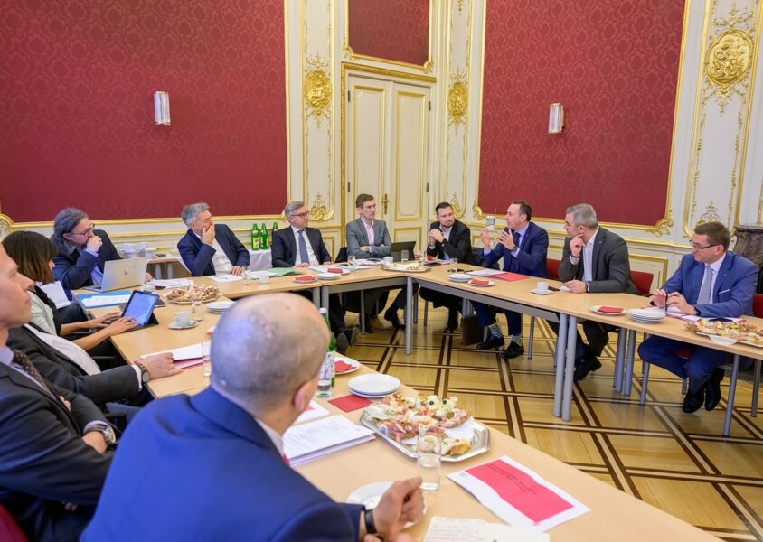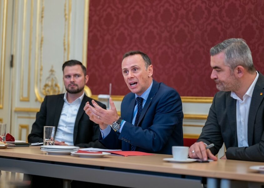 Sportminister Werner Kogler und Finanzminister Magnus Brunner stellten im Haus des Sports mit den Sportlandesräten Wiens (Peter Hacker), Niederösterreichs (Jochen Danninger), Oberösterreichs (Markus Achleitner) und des Burgenlands (Heinrich Dorner) Unterstützungsmaßnahmen für gemeinnützige Sportvereine, die von beträchtlichen Mehrkosten im Bereich Energie betroffen sind, vor. Kogler präsentierte dabei erste Details zum Energiekostenausgleich.
