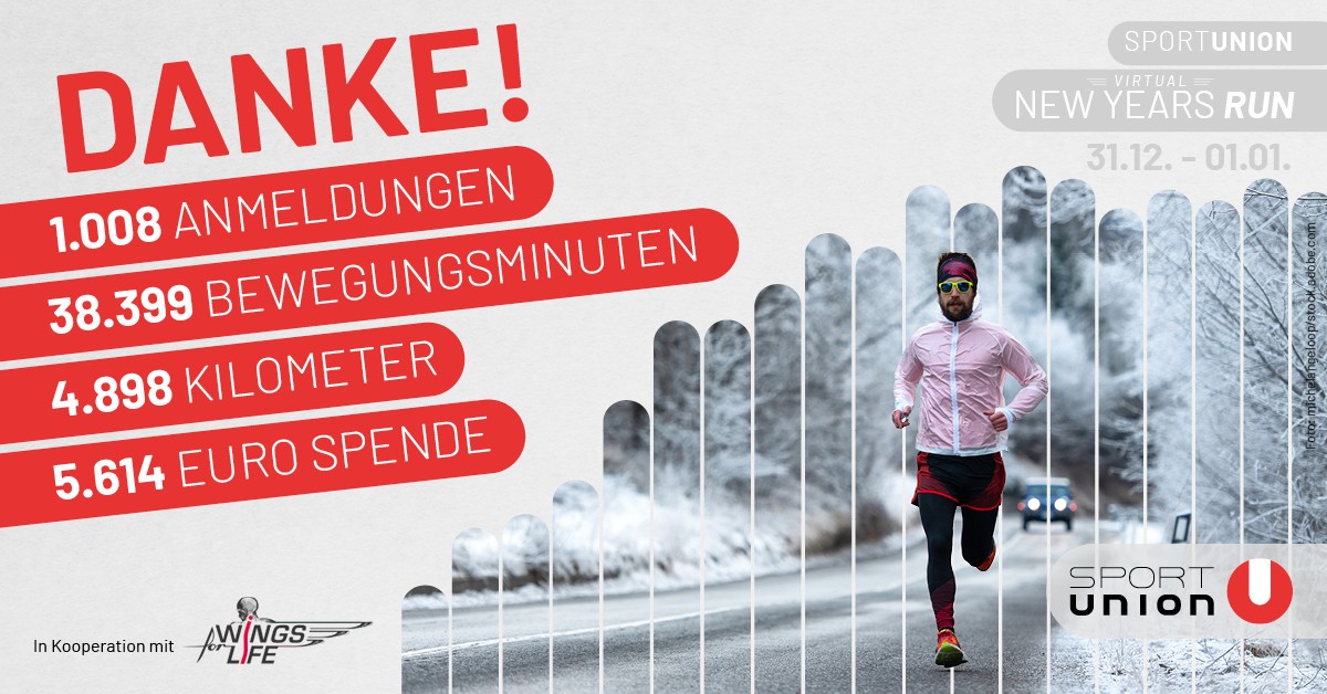 Der Virtual New Year Run ist seit der Premiere im Jahr 2020 ein Erfolg: Die Startgebühr betrug auch diesmal 5 Euro für Erwachsene, während Kinder kostenlos mitmachen konnten. “Die SPORTUNION leitet dann 2,50 Euro des Startgeldes sowie jede freiwillige Zusatzspende direkt an Wings for Life weiter”, so SPORTUNION-Präsident Peter McDonald. “Insgesamt konnte daher diesmal eine beeindruckende Gesamtsumme von 5.614 Euro für die Rückenmarksforschung gesammelt werden.” Begleitende Gewinnspiele sorgten für zusätzlichen Anreiz und führten dazu, dass der Lauf sowohl in den sozialen Medien als auch in der Lauf-Community große Resonanz fand. Im Detail bedeutet das: Insgesamt dokumentierten 1008 Teilnehmer:innen aus 106 Vereinen ihre Läufe oder Spaziergänge online, legten gemeinsam 4.898 Kilometer zurück und waren in Summe 38.399 Minuten unterwegs.
